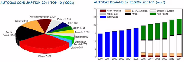 Autogaz posiada również wskaźnik oktanowy na poziomie 90-110. Użytkowanie autogazu jest wyjątkowo popularne w Unii Europejskiej, Turcji, Australii. Korei Południowej, Hong Kongu, Indiach, Chorwacji, Litwie, Macedonii, Serbii oraz na Filipinach. W tych krajach przemysł autogazowy jest wysoko rozwinięty. Zużycie autogazu w 2011 TOP10 (‘000t).